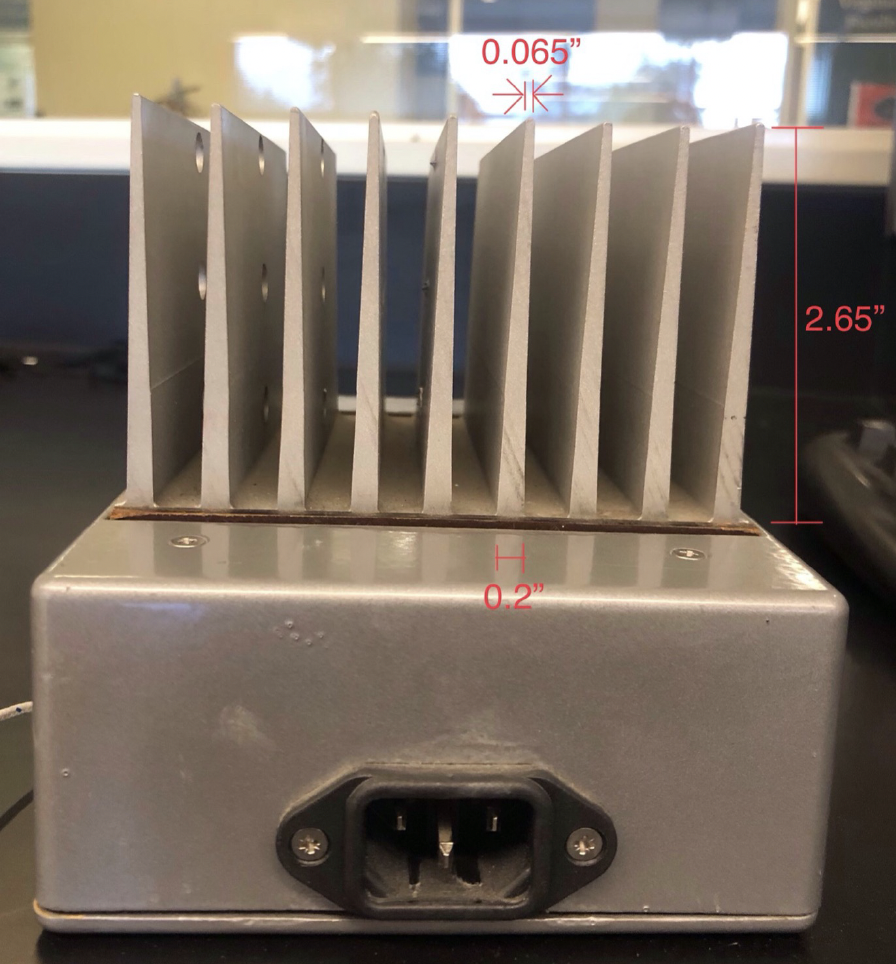 The flat fins have a small taper from base to tip, and thermocouples are inserted through holes in the fins.