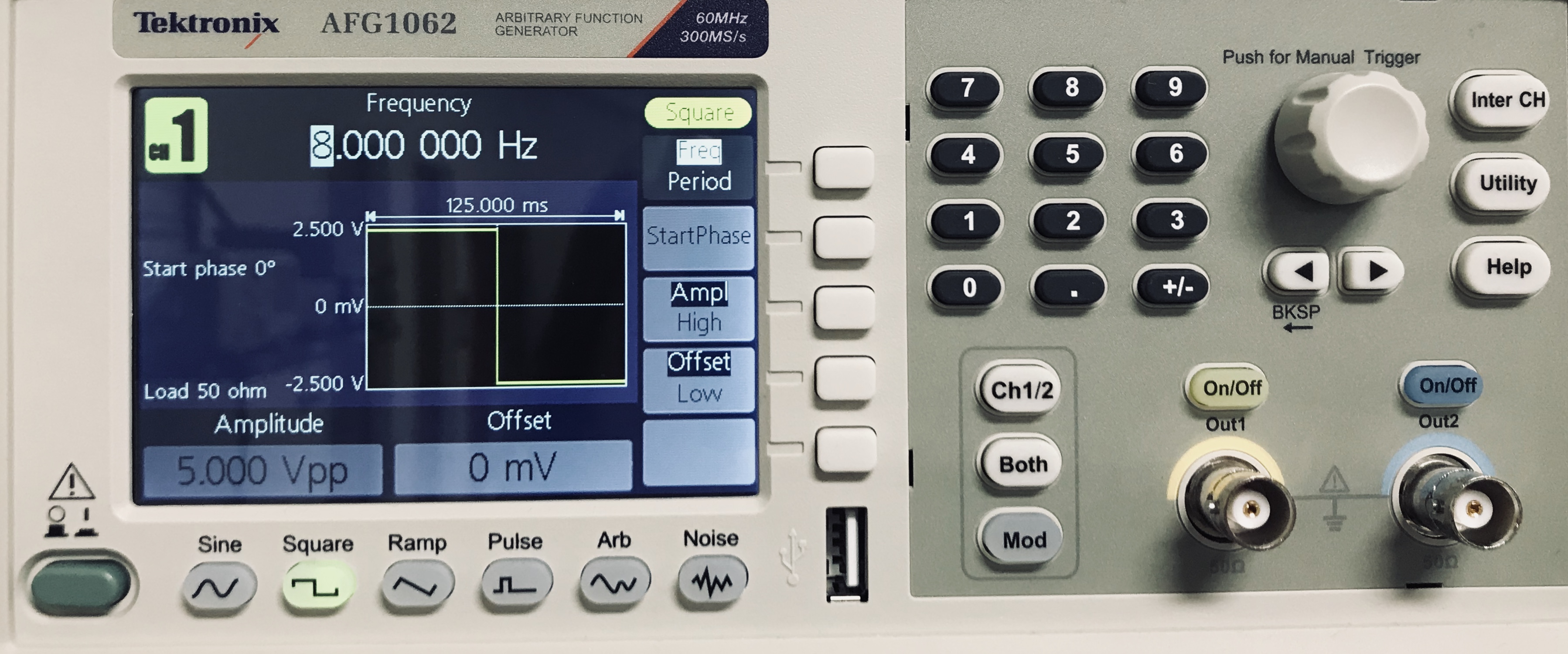 We will use the Tektronix AFG1062 function generator (user manual). Figure 2 shows the front panel.