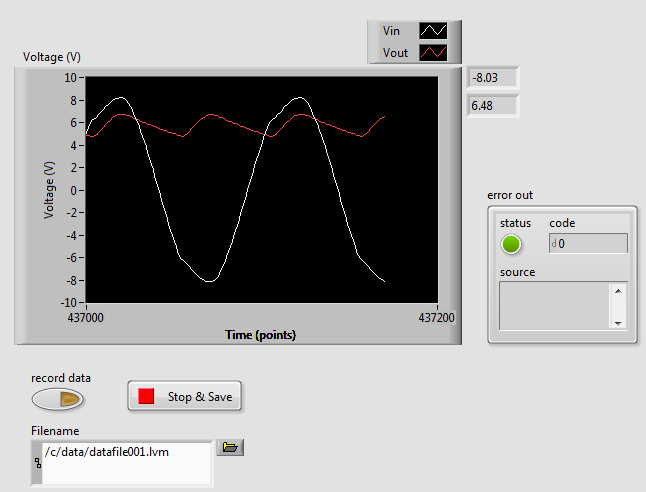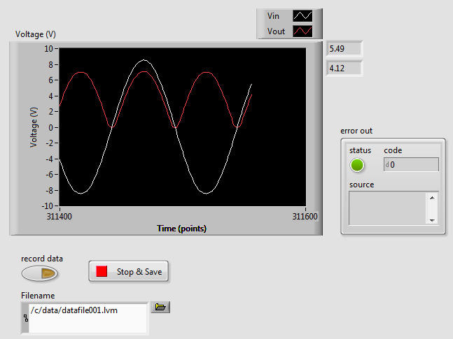 Use your VI to measure the source voltage \(V_S(t)\) and the output voltage \(v_o(t)\) across the load resistor. To capture data and save it to a file, use the following procedure: