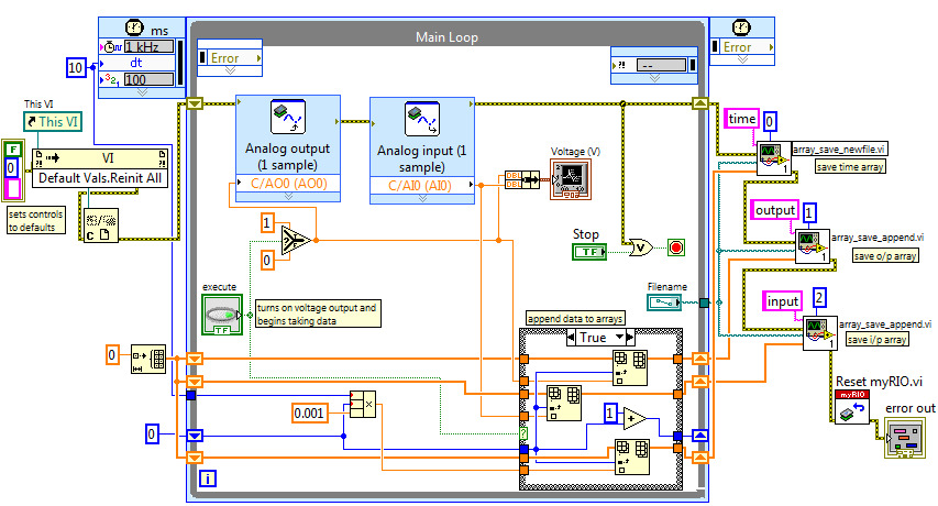 AO0 when the user toggles a button named executeAI0+, continuously.lvm datafile on the myRIO via the array_save_newfile.vi and array_save_append.vi functionsThe code that precedes the Main Loop resets the controls on the front panel to their default values. The block labeled This VI is the VI Server Reference VI and is found in the Functions > Application Control palette. The block labeled Defaults Vals.Reinit All is the Invoke Node VI and is found in the Functions > Application Control palette. After wiring the VI Server Reference to the input of Invoke Node, right-click on the word Method on the Invoke Node VI and select Method for VI Class>Default Values > Reinitialize All to Default. Finally, the block labeled C is the Close Reference VI and is found in the Functions > Application Control palette.